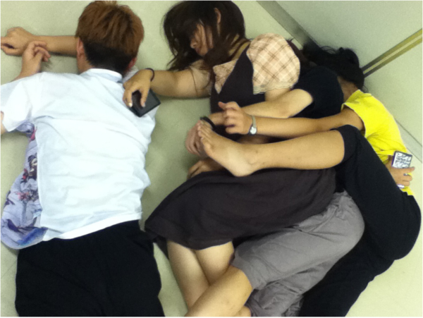 通し稽古の前に、女性キャスト+演出が仲良くお昼寝しています