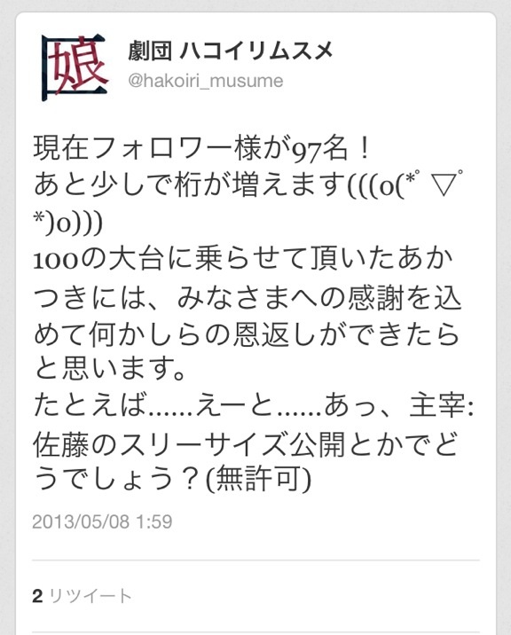 以上、自分でもなにがなんやら、主宰:佐藤のスリーサイズ予想でした。フォロワー100人突破、本当にありがとうございます!