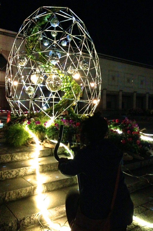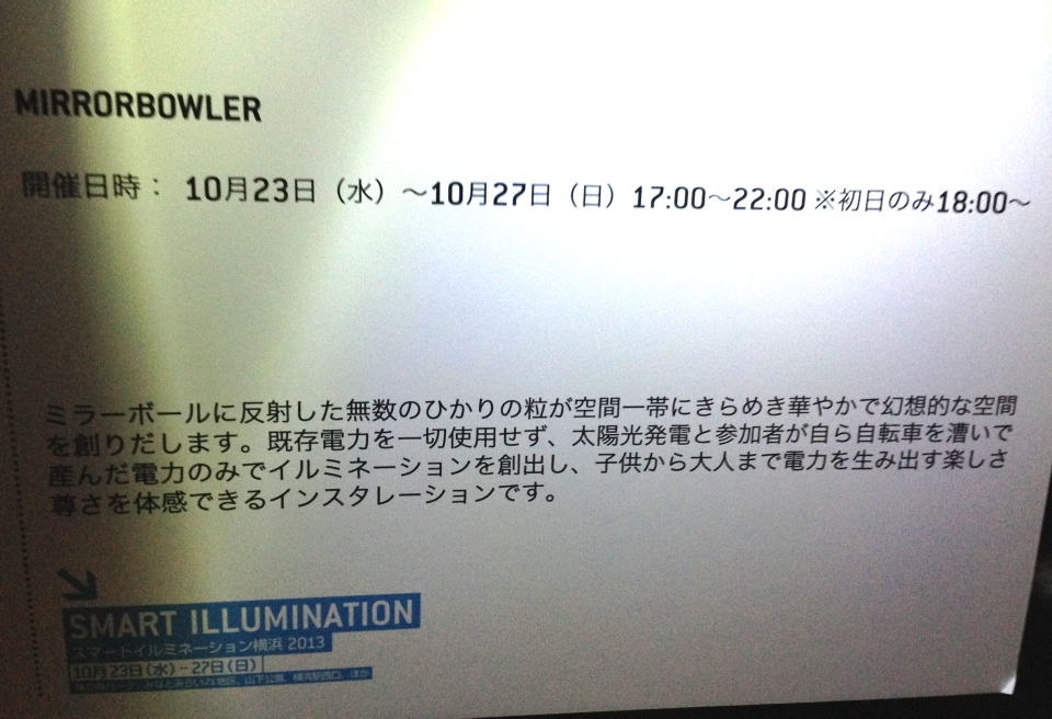 どうやら展示のひとつ(ただしくはインスタレーションという、環境を巻き込んだ?芸術作品なのですがよくわかりません>< 芸術学部なのに!)だったようで、前に並んでいる自転車を回すと光るらしいです。